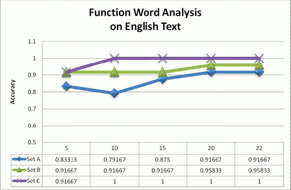 In the year 2005, Putnins et al. [21] used function word frequency and Trigram Markov model with Multiple Discriminant Analysis (MDA) and Word Recurrence Interval. Based on the results, he showed that the function word frequency and Trigram Markov Model gives a relatively high accuracy results in authorship attribution thus has the ability to provide statistical evidence to authorship attribution problems. However it was shown by him that the WRI does have poor performance in authorship attribution.