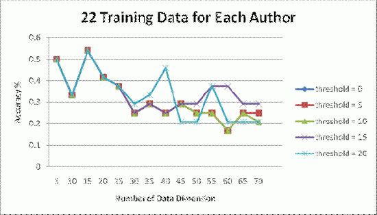 Looking at the results above, as the number of training data increases, the overall accuracy increases. Furthermore the graph shows that the results tend to be more consistent regardless of the threshold value except the later stage where the data dimension value is approximately 55.