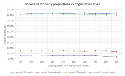 To provide more evidences to prove this theory, several degradation algorithms introduced in section 5.2 have been applied and changes of ethnicity proportions during different degradation processes have been observed and recorded. 2 sample DNA reference files are degraded into 9 files at different levels from 90% to 10% SNPs remaining. The proportion of first 2 largest ethnicity regions of each degraded files have been plotted on line graphs. Figure 18 is the line graph that show how the means of ethnicity proportions change via the degradation process with standard error provided. As the graph shown, each region proportion fluctuate at a certain level. For instance the percentage of first region of sample 1 fluctuate at around 83% which is a close value to the original proportion 81.44%. However, error bars or standard errors of each region become larger, as more SNPs are removed, which indicate that as more SNPs being removed, the proportions presented in ethnicity reports become less accuracy. But in another case, the highest standard error for first and second region proportions of sample 1 and 2 are 1.32%, 1.41%, 1.33% and 1.03%. None of these standard errors exceed 1.5% which can be seen as an acceptable errors. Therefore the project conclude that when a large amount of SNPs are removed from a set of DNA data, the ethnicity report generated from the DNA data would be influenced, but the results are still acceptable for identifying owner’s ethnicity.